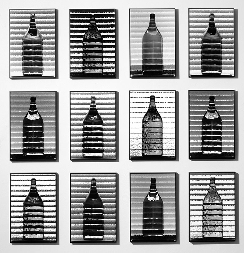Ein einfacher, vorgefundener Alltagsgegenstand, die Dopplerflasche (Fritz Simak wuchs teilweise im Weinviertel auf) wird Objekt der fotografischen Untersuchung. Simak lagerte sein Fixierbad zur Filmentwicklung im Badezimmer in einer Dopplerflasche. Die Flasche stand am Fensterbrett und das undurchsichtige Glas des Badezimmerfensters erzeugte Reflexionen der Lamellenjalousine in der Flasche. Dieses zufällig vorgefundene Setting lies Simak noch weiter experimentieren. Dabei ändert er nicht den Standpunkt und die Perspektive seiner Kamera oder das Objekt ansich, sondern lediglich den Lichteinfall durch die dahinterliegende Jalousien am Fenster. Durch unterschiedliche Kontrastfilter bei der Vergrößerung entsteht so eine abwechslungsreiche Serie des gleichen Motivs.