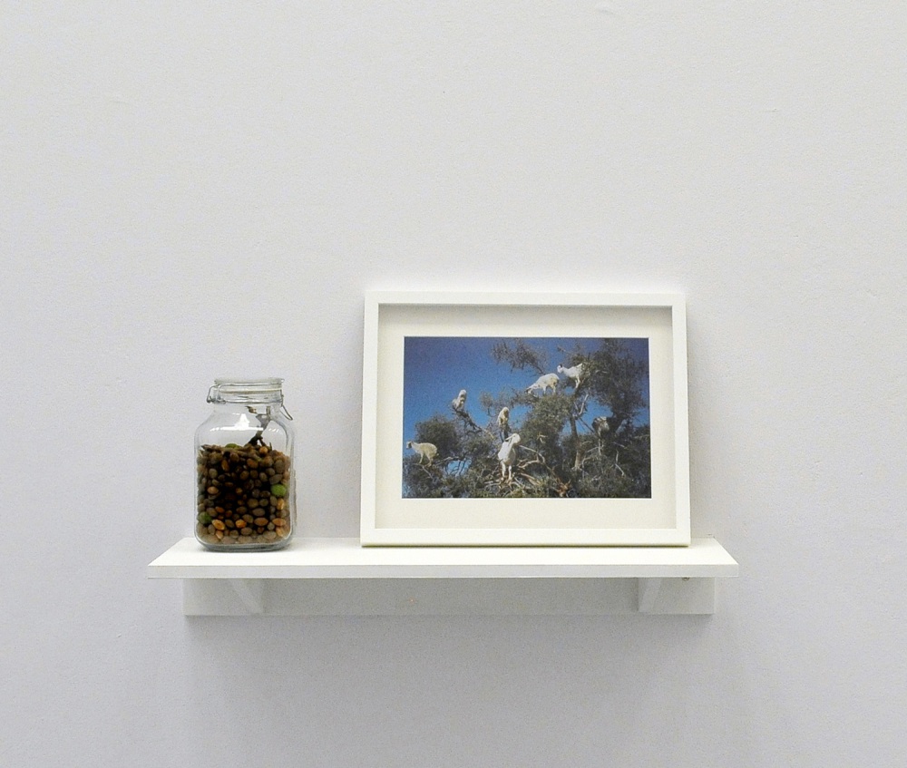 C-Print gerahmt, Glas mit Nüssen des Argan-Baumes, Holzregal