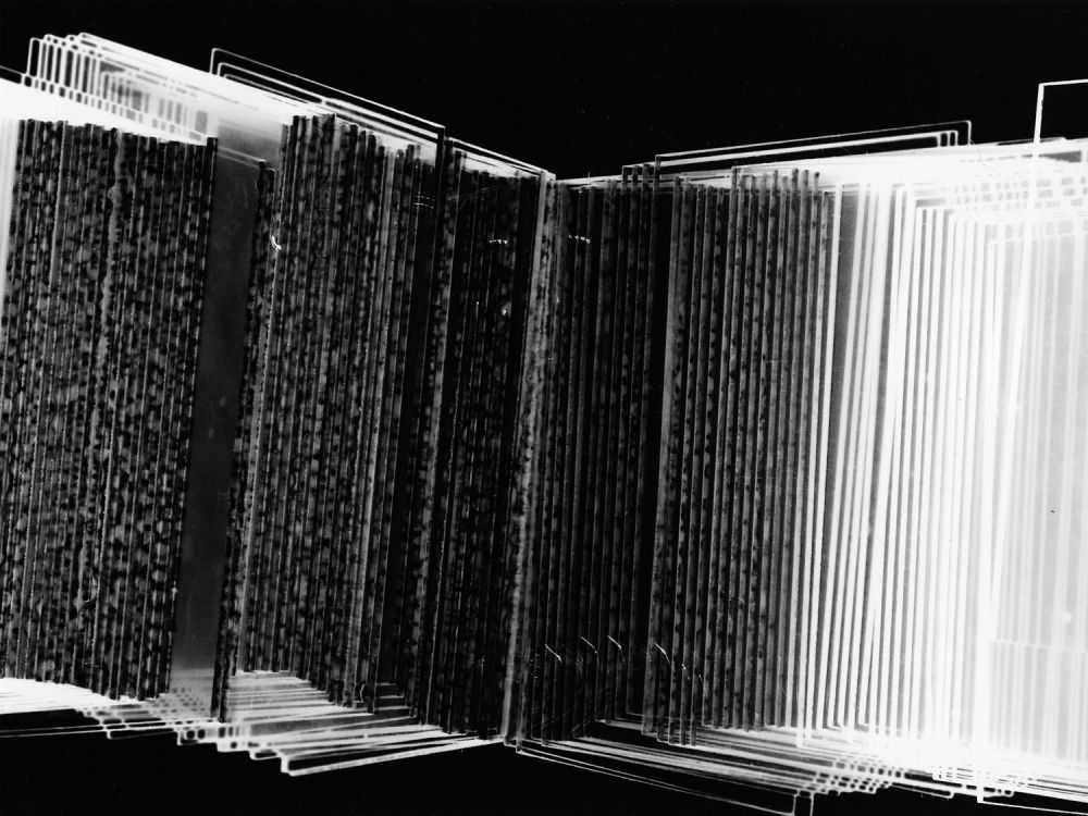 Die Moholys experimentierten bei ihren Fotogrammen mit dem, was sie fanden - Haushaltsgegenstände wie Kämme oder Scheren, aber auch ihre Körper oder Teile davon wie beispielsweise ihre Hände oder ihre Gesichter. Jan Tichy dagegen arbeitet in seinen Fotogrammen auf Papieren im Format 18 x 24 cm mit kleinen Glasplatten im Format 9 x 12 cm. Eben diese beiden Formate, 9 x 12 cm bzw. 18 x 24 cm, sind charakteristische Formate großformatiger fotografischer Negative, wie sie auch Lucia Moholy am Bauhaus verwendet hat.