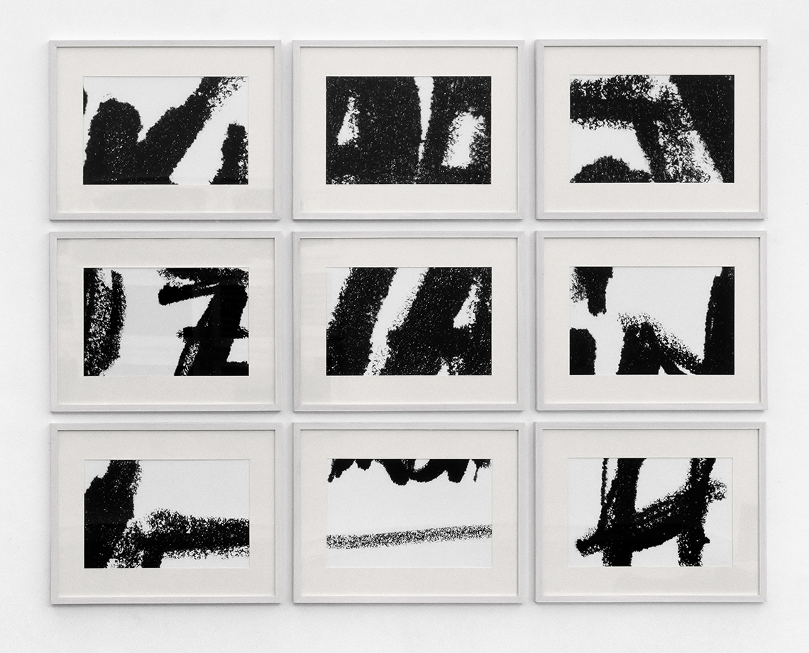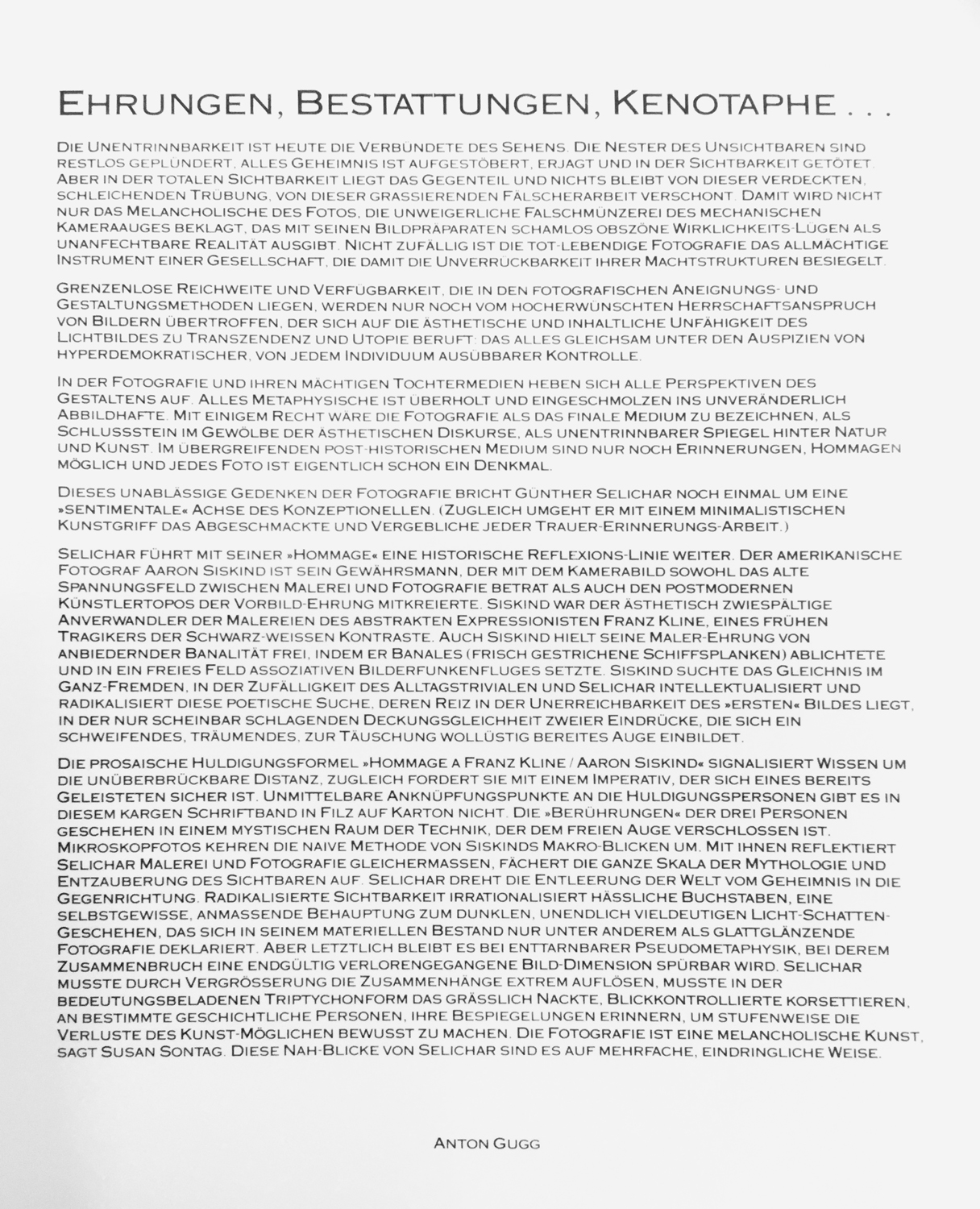 Das Interesse von Günther Selichar am Detail und dessen Abstraktionspotential reicht bis in die 1980er-Jahre zurück, zur neunteiligen Serie "Hommage à Franz Kline/Aaron Siskind" (1985). Breite schwarze Pinselstriche, ohne Rücksicht auf die Ränder des Blattes, scheinen vor allem Spuren einer gestischen Bearbeitung des Untergrundes zu sein, wie man sie von Franz Kline kennt. Falsch. Sie basieren vielmehr auf einem konkreten Schriftbild, das ähnlich wie in anderen Serien von Selichar, stark vergrößert wurde. Günther Selichar hatte im Rahmen seines Kunstgeschichtsstudiums durch ein Fulbright-Stipendium am Art Institute of Chicago 1984–1985 die Gelegenheit, an einem Stereomikroskop zu arbeiten. Was eigentlich zur Kontrolle kleinster Schäden an historischen Fotografien gedacht war, funktionierte der damals 24-Jährige in eigener Sache um und reproduzierte Details jenes in dicken schwarzen Versalien, absichtlich verwackelt geschriebenen Titels der Arbeit. Neun Ausschnitte, die den lesbaren Buchstaben hinter sich lassen, ihn aus der Mitte drängen, an den Kanten ausfransen, als würde der Farbauftrag abreißen, verschieben das Schriftbild zum abstrakten Bild in der Manier Klines und auch des Fotografen Aaron Siskinds, der ebenfalls eine fotografische Hommage an seinen Malerfreund gemacht hatte.