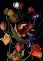 Der Scanner, auf den die Künstlerin die Blumen legt, zeichnet streng linear das Ertastete auf. Nähe bewirkt Detailgenauigkeit, während Entferntes in ein undurchdringlich wirkendes Dunkel entschwindet. Objektiv und ungeschönt baut der Scanner Pixel für Pixel ein Abbild der Blumen auf, wobei aber auch Beschädigungen der zarten Blüten oder erste Anzeichen des hinter all der Pracht schon lauernden, unabwendbaren Verfalls sichtbar gemacht werden. Die Tulpe wird bei Luzia Simons aufgrund ihrer “nomadischen” Geschichte zur Metapher für Mobilität, Globalisierung, und interkulturelle Identität.
