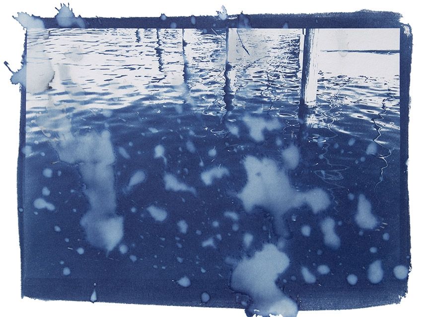 Eva-Maria Raab erzeugt in ihren lake prints Spuren und poetische Skulpturen. Sie bezieht das Wasser des Sees in ihre Cyanotypien ein und bewahrt so diese seltene und kostbare Ressource. Auf diese Weise nutzt sie ein chemisches Verfahren, um auf die gesellschaftliche Herausforderung hinzuweisen, die der Zugang zu Wasser darstellt.