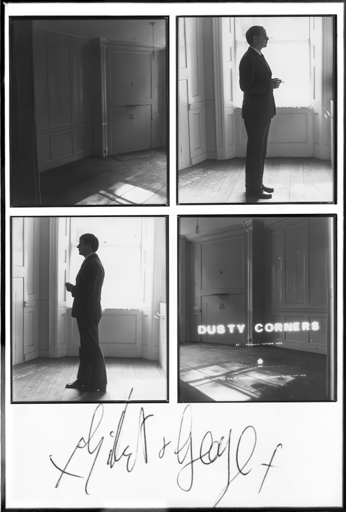 Dusty Corners ist ein bedeutendes Werk aus der Frühphase des künstlerischen Schaffens des britischen Künstlerduos Gilbert & George. In dieser Arbeit verwendeten sie ihre charakteristische Methode, bei der sie ihre eigenen Körper als Hauptbestandteil der Kunstwerke integrieren, häufig in stark stilisierten, ikonografischen Formen. Die Serie zeigt das Duo in verschiedenen Posen, oft umgeben von symbolischen Elementen und surrealen Kompositionen, die an religiöse oder politische Ikonografie erinnern. Das Werk ist ein hervorragendes Beispiel für die sogenannte "Living Sculptures"-Periode von Gilbert & George, bei der sie ihre Kunstwerke nicht nur als Objekte, sondern als fortlaufende Performance betrachteten. Sie wollten ihre Kunst so interaktiv wie möglich machen und die Barrieren zwischen Künstlern, Kunst und Publikum durchbrechen. Dusty Corners reflektiert die sozialen, politischen und kulturellen Spannungen der Zeit, insbesondere in Bezug auf Themen wie Sexualität, Identität und gesellschaftliche Normen. Es ist auch eine Reflexion über die Komplexität des urbanen Lebens und die Isolation, die oft in den Großstadtlandschaften zu finden ist, die sie so oft in ihren Arbeiten thematisierten. Diese Arbeit ist eine signierte Postkarte der wesentlich größeren Originalabzüge.