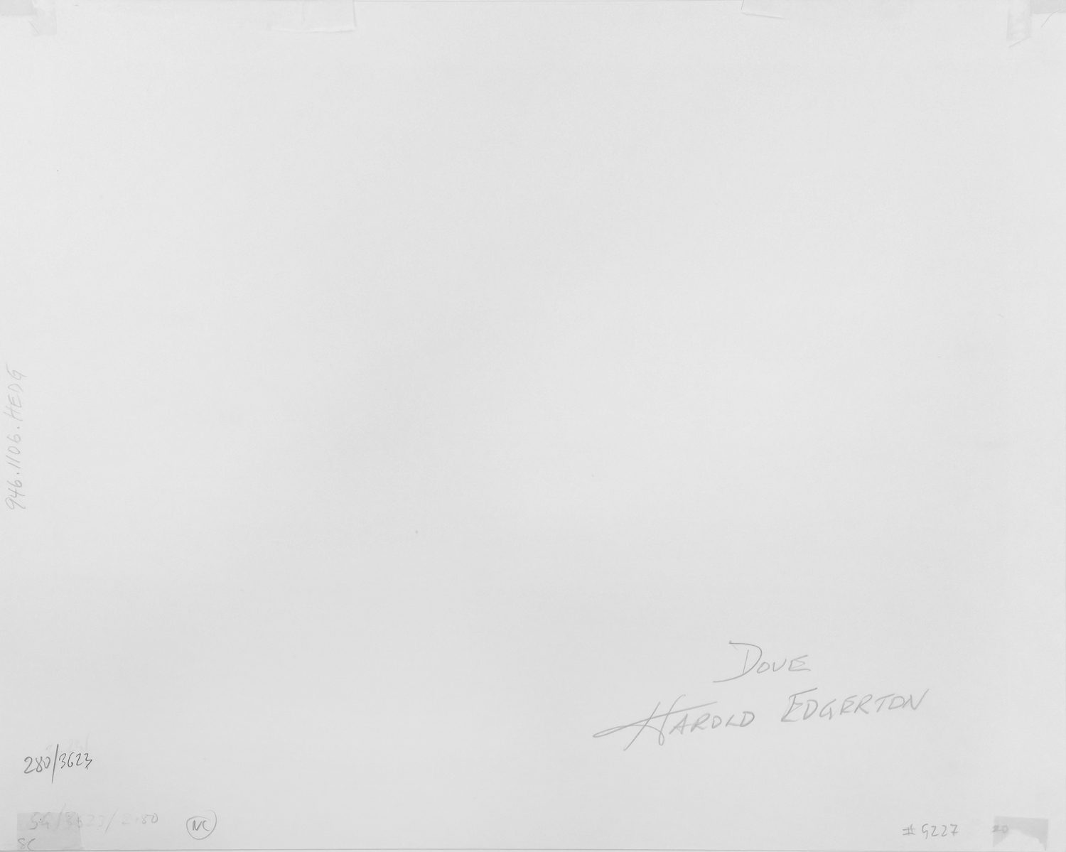 In seinem Labor am MIT in Cambridge dokumentierte er in zahllosen Versuchen Projektilbahnen, fallende Tropfen, sportliche Bewegungen oder den Flug von Vögeln. Sobald die Taube freigelassen wurde, breitete sie ihre Schwingen aus. Durch die präzise Synchronisation von Stroboskop und Kamera wurde der Flügelschlag in jeder Phase gestochen scharf erfasst – der vorliegende Abzug ist ein Bild aus einer solchen Sequenz. Der Schatten an der Laborwand verstärkt dabei die dramatische Wirkung und verweist zugleich auf das experimentelle Setting.