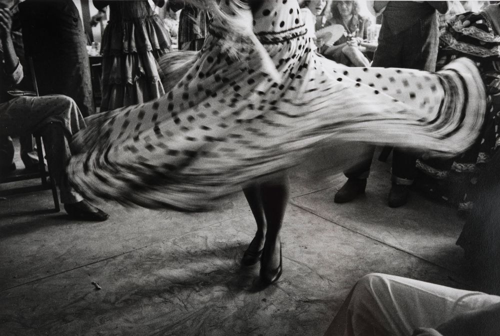 Die auf einem Jahrmarkt in Spanien gemachte Aufnahme zeigt nur den unteren Körperteil einer Tänzerin, deren weit ausschwingendes Kleid die Bildfläche dominiert. Die Beine und Füße der Tänzerin sind klar erkennbar, wohingegen das Kleid in der Unschärfe der Bewegung verschwindet. Um die Tänzerin herum sitzt oder steht Publikum, die Fotografin mitten unter ihnen. Inge Morath beobachtet nicht distanziert, sondern ist Teil Mitten im Geschehen – wir als Betrachtende werden fast hineingezogen in die Drehbewegung.