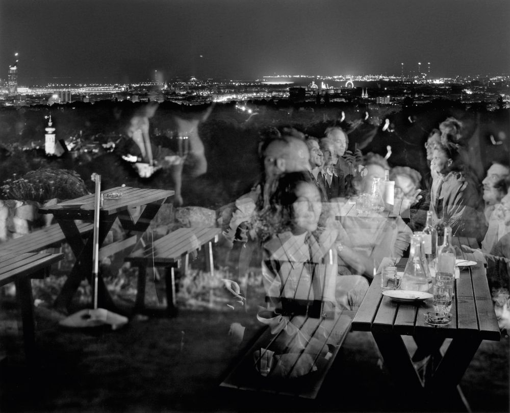 Der Anwalt und Kunstsammler Martin Maxl lud zu einem Fest beim Heurigen, von dem man, wie er mir erzählte, einen schönen Blick auf Wien habe. So nahm ich meine 4×5-Inch-Kamera mit und baute sie auf. Als es plötzlich zu regnen begann, ließ das die Gäste ins Innere flüchten. Ich aber schützte meine Kamera mit einem Regenschirm und belichtete relativ lange Wiens Panorama bei Nacht. Inzwischen hatte sich der Regen verzogen. Der Gastgeber kehrte auf meine Bitte mit einigen Freundinnen und Freunden in den Garten zurück, ich öffnete wieder den Verschluss, und so konnte ich die Gäste einzeln mit dem computergesteuerten Sensorblitz, der bei einer bestimmten Blende immer die richtige Lichtmenge abgibt, aus nächster Nähe belichten. So habe ich viele Belichtungen auf einem Negativ vereint.