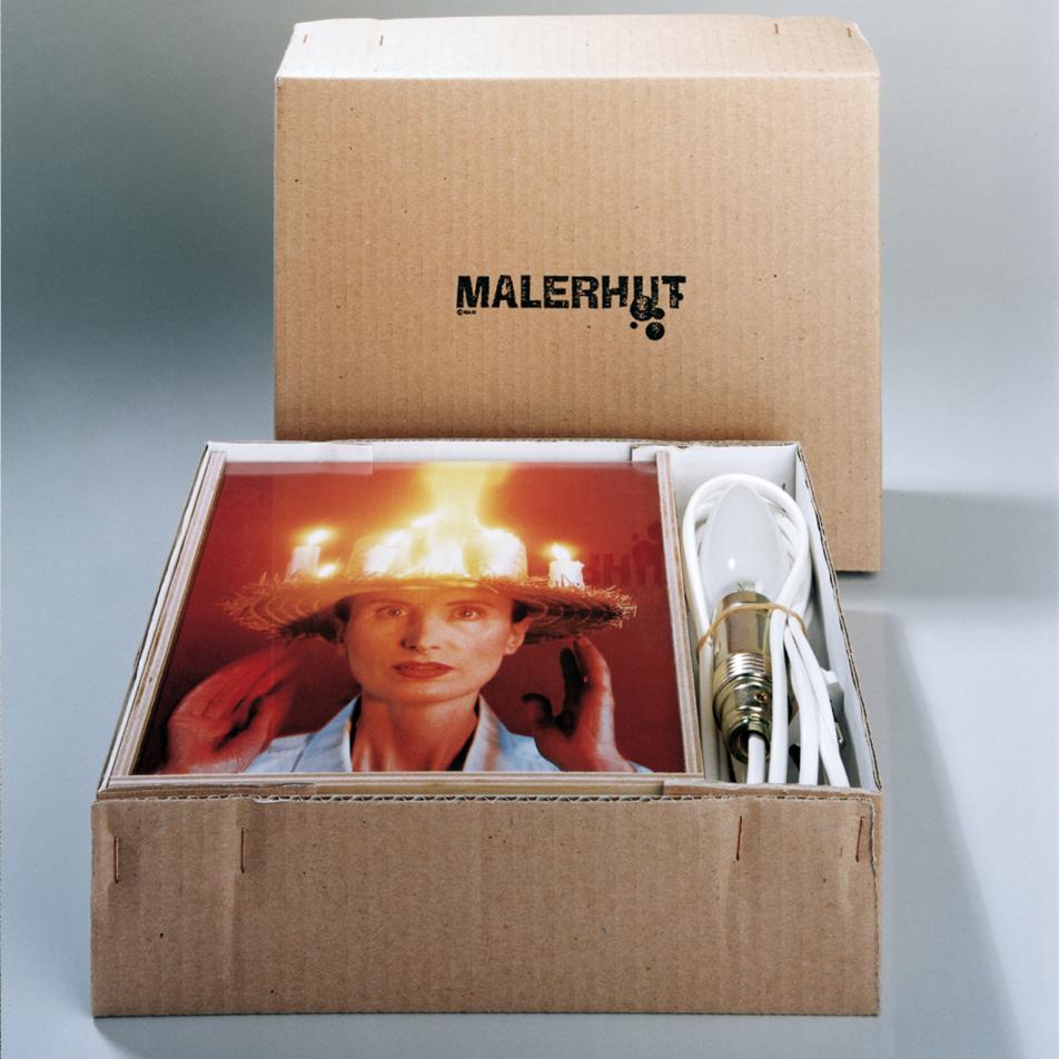 Tortenkiste, Filmstill (Offsetdruck) aus der Performance "Malerhut", Acrylglas, elektrisches Licht, ursprünglich enthielt der Kasten einen Künstlerkuchen
