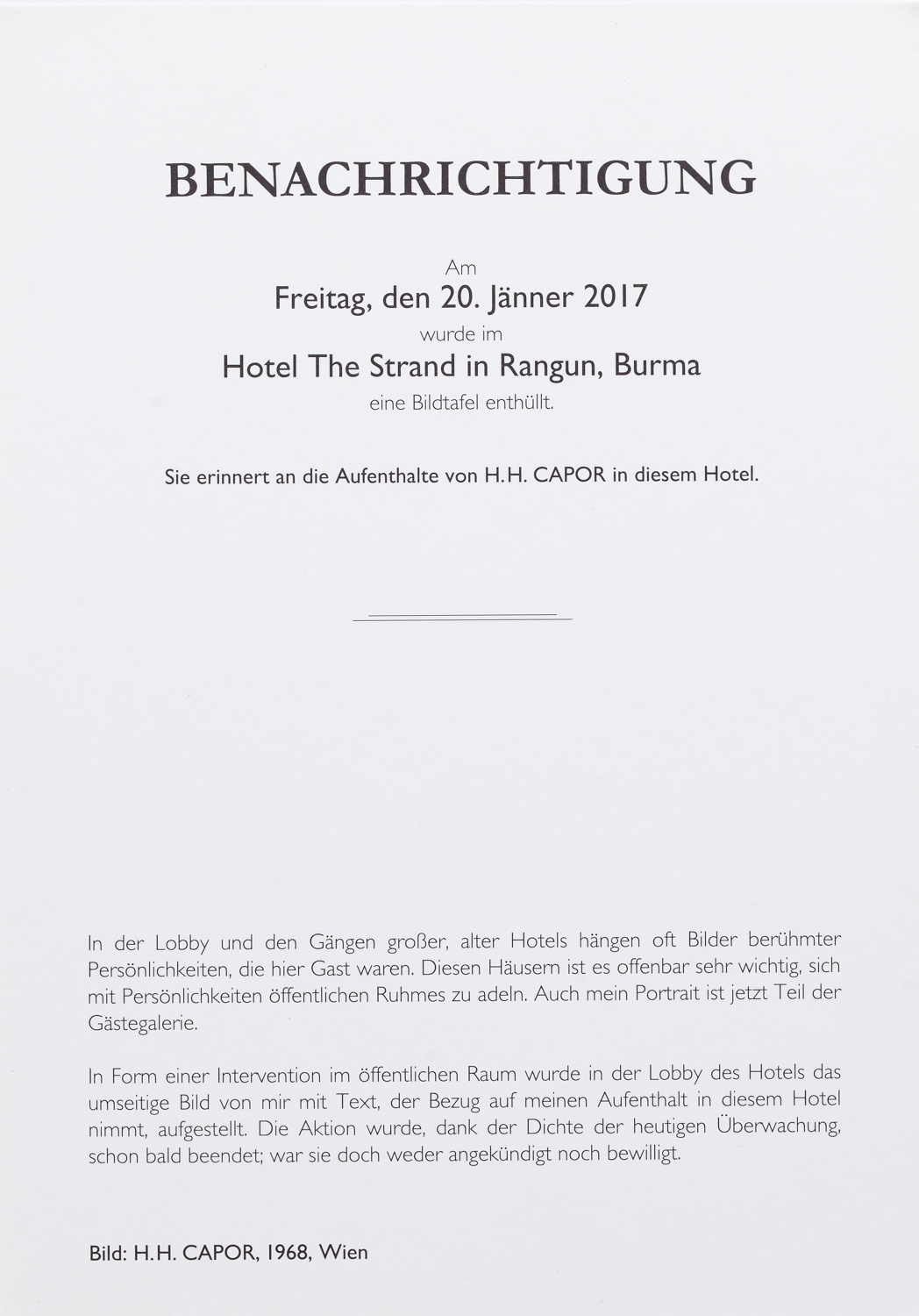 In the form of an intervention in public space, the picture of me overleaf with text referring to my stay in this hotel was placed in the lobby of the hotel. The action, thanks to the density of today's surveillance, was soon terminated; after all, it was neither announced nor approved.