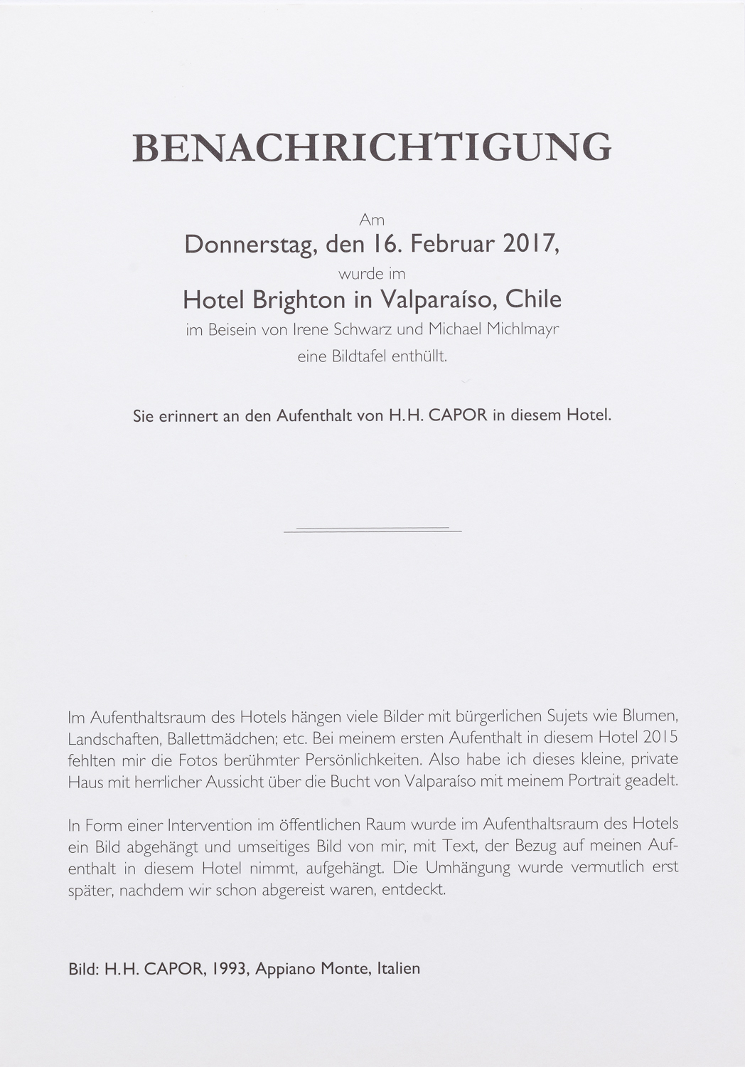 On Thursday, February 16, 2017, a plaque was unveiled at the Hotel Brighton in Valparaíso, Chile, in the presence of lrene Schwarz and Michael Michlmayr.